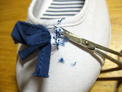 Eu am avut niste balerini cumparati la oferta, cu funda marinareasca, dar din pacate nu mi-au prea placut, iar albul nu e o culoare pe care sa o pot purta, mai ales la pantofi, la cat sunt de neatenta. Asa ca a urmat singurul lucru fireresc care ii putea face purtabili.